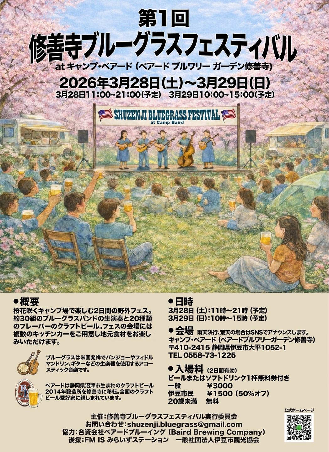 桜の咲く季節、緑豊かなキャンプ場にて。ベアードビールの美味しいクラフトビールを飲みながらブルーグラスミュージックを堪能できる野外フェスティバルであり修善寺では初めての開催です。