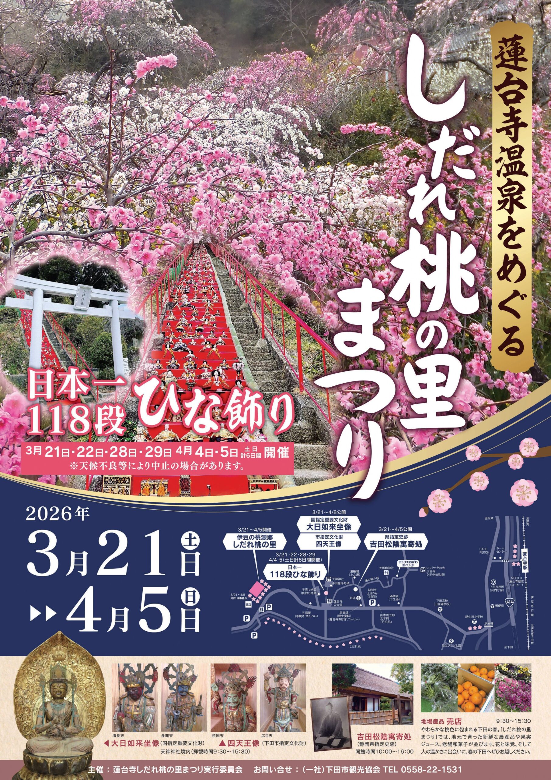 蓮台寺温泉「しだれ桃の里まつり」が開催されます。今年も「日本一118段のひな飾り」(3/21・22・28・29・4/4・5)が登場。国の重要文化財「大日如来坐像」(3/21~4/8)と、県史跡文化財「吉田松陰寓寄処」(3/21~4/5)も公開します。