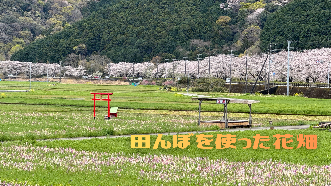 農閑期の広大な田んぼに7種類の花の種がまかれ、2月中旬から開花し始め5月5日まで、田んぼが一面見渡す限りの花畑となります。