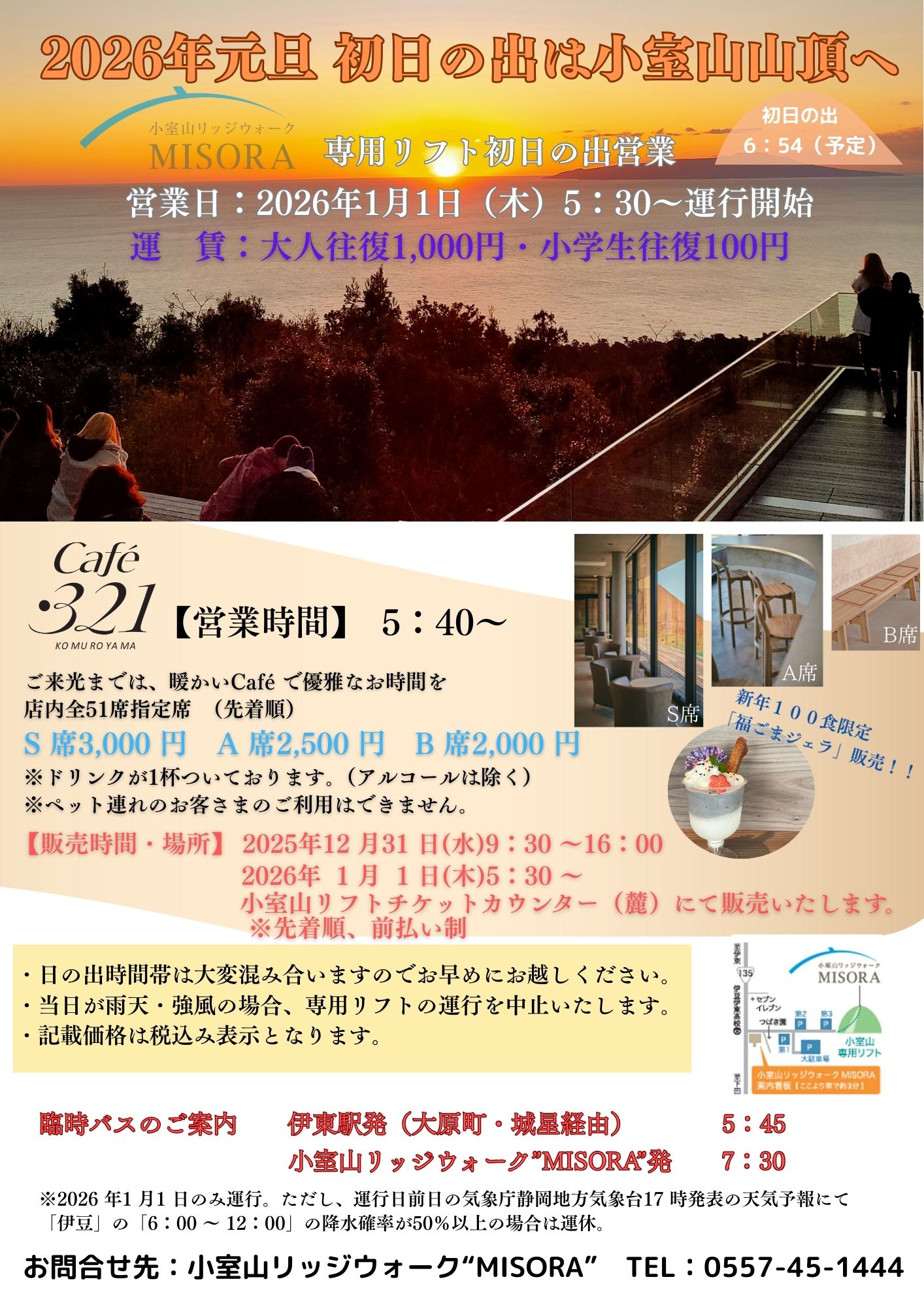 伊豆大島の傍らから登る初日の出と、その光を浴びる富士山が見られる「初日の出観覧」の絶好のスポットです。そのため、大室山リフトでは元旦のリフト特別運行を行っています。