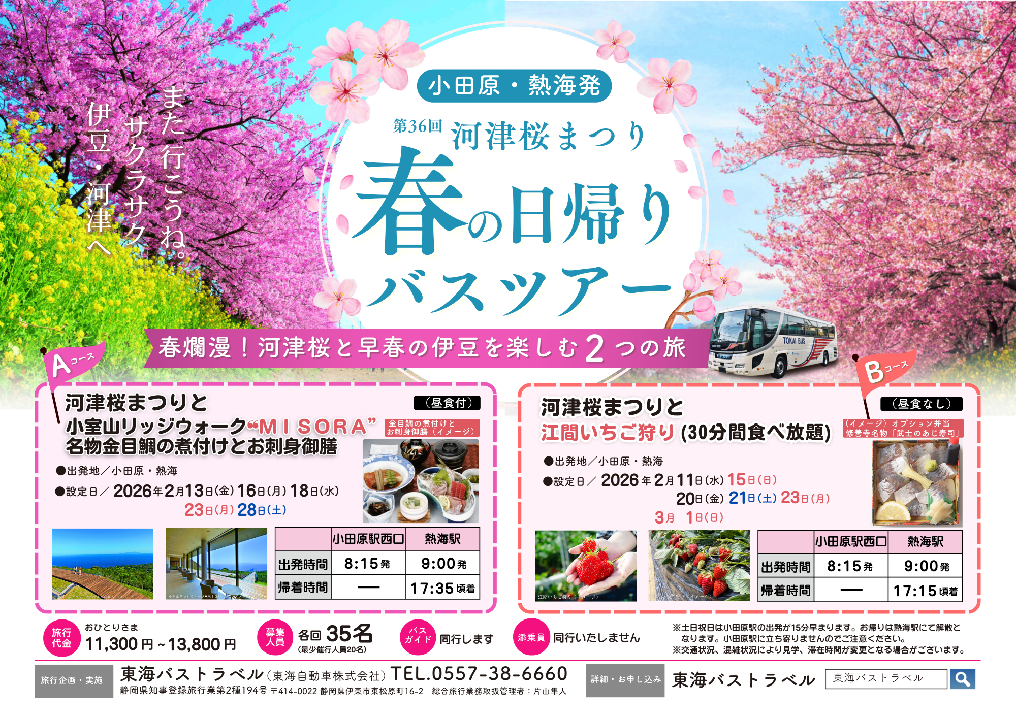 伊豆の春を告げる風物詩のひとつ「河津桜まつり」2026年も東海バストラベルでは「着地型商品」として「河津桜まつり」を中心とした特色の異なる日帰りバスツアー2コースを予約受付中です。早咲きの桜鑑賞とともに地元伊豆半島のバス会社が企画し、伊豆を知り尽くしたバスガイドのご案内で早春の伊豆を巡ってみませんか?🍓🌸🚌